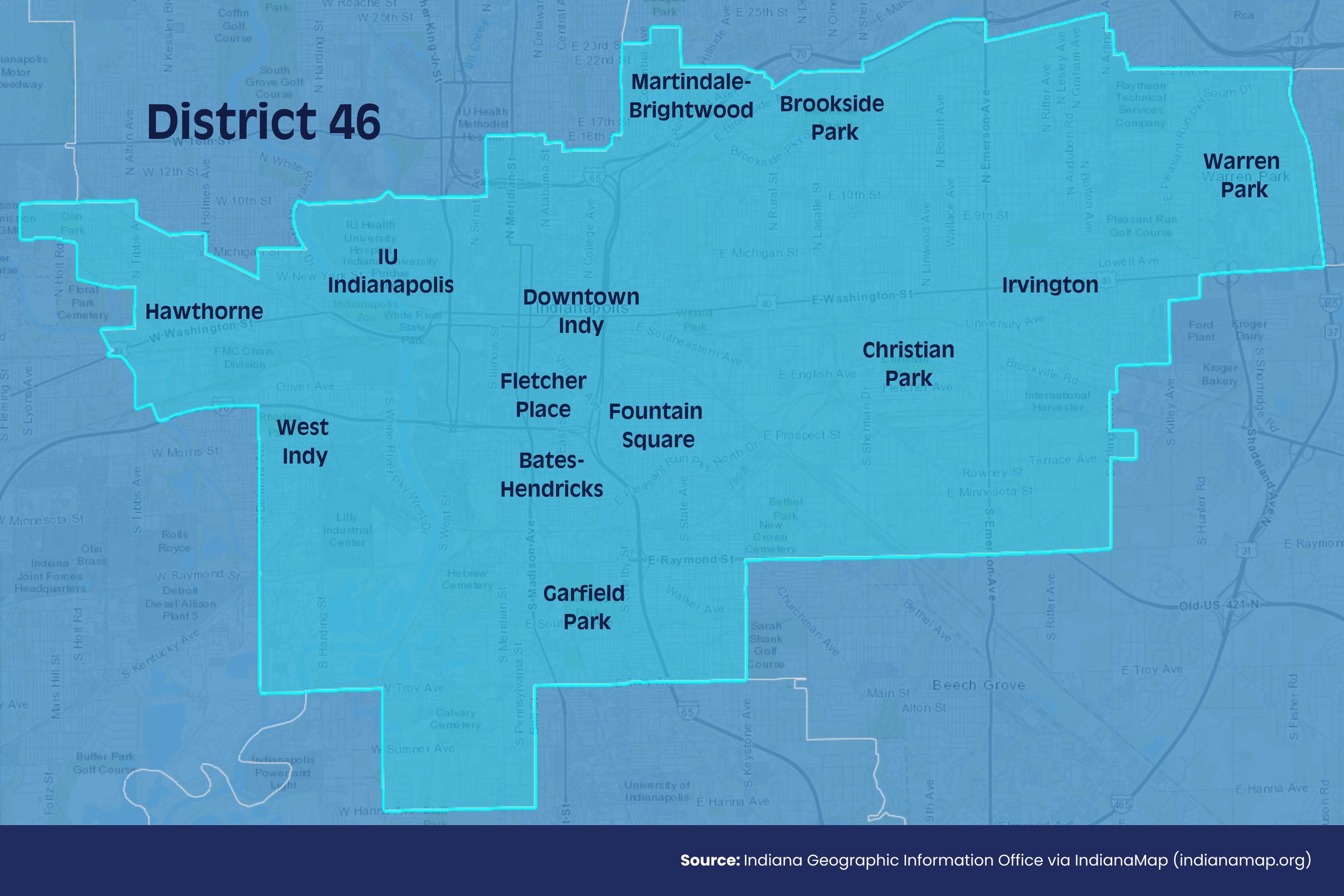 Indiana Senate District 46 encompasses portions of Indianapolis, including downtown Indianapolis, Irvington, Fountain Square, Garfield Park, Warren Park, and parts of Center, Wayne, Warren, and Perry townships.